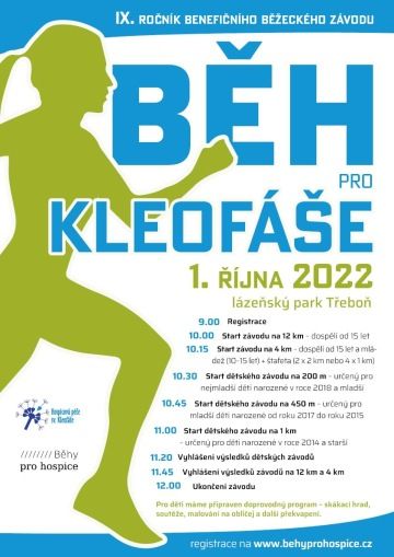 Rádi běháte nebo si jen chcete dopřát krásné podzimní dopoledne s celou rodinou? Pro vás všechny jsme opět po roce připravili benefiční Běh pro Kleofáše. Rezervujte si již nyní do svých kalendářů termín 1. října a poběžte s námi! Pro nejzdatnější běžce bude připravena unikátní přírodní trasa okolo rybníka Svět. Ostatním nabídneme příjemnou čtyřkilometrovou trasu. Letošní novinkou zde bude možnost běžet štafetu. Pro děti chystáme kratší trasy dle věku a také bohatý doprovodný program. Registrace jsou již nyní spuštěny na webových stránkách www.behyprohospice.cz., anebo na místě v den konání akce. Garantujeme vám krásný zážitek a spokojenost spojenou s podporou dobré věci.
