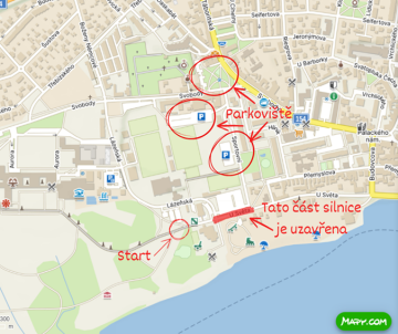 Letos je bohužel kvůli rekonstrukci uzavřeno nejbližší velké parkoviště u startu včetně části příjezdové cesty. Pro parkování vašich aut využijte prosím parkoviště u sportovní haly, parkoviště na místě bývalého autobusového nádraží nebo parkovací místa v lokalitě „Na Rybníčku“. Přikládáme mapu s označením parkovišť. Pokud nejste z Třeboně nebo si nejste čímkoliv jistí, nebojte se na nás obrátit. Rádi vám poradíme. Kontaktovat nás můžete i na telefonním čísle 731 331 732.