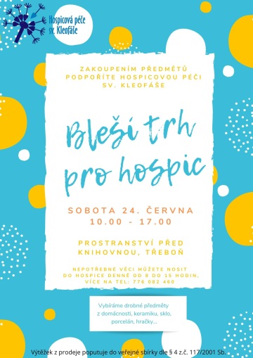Opět po roce se zúčastníme sousedské slavnosti Zažít Třeboň jinak. Tentokrát se potkáme 24. června před městskou knihovnou. Věci na blešák můžete nosit do hospice denně od 8 do 15 hodin, případně po domluvě na tel.: 776 082 460. Děkujeme!