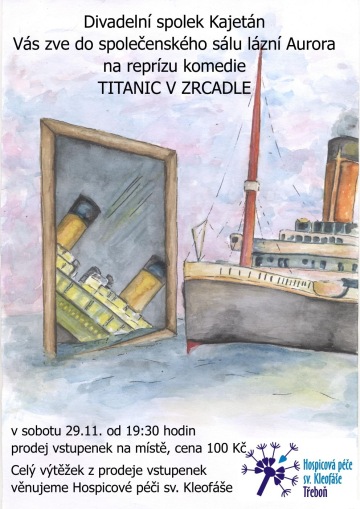 Divadelní spolek Kajetán zve na benefiční představení komedie o životním koučinku s názvem Titanic v zrcadle. Představení bylo inspirováno divadelní hrou Cry, baby, cry (kolektiv českých autorů). Přijďte se pobavit a podpořit náš hospic do sálu Lázní Aurora v sobotu 29. listopadu od 19.30 hodin.