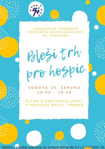 Tradiční hospicový blešák se uskuteční i letos – konkrétně 25. června v rámci akce Zažít Třeboň jinak. Jako místo této nevšední akce organizátoři vybrali altánek a přilehlý parčík v těsné blízkosti Bertiných lázní. Máte-li za sebou generální úklid nebo se jen potřebujete zbavit pár nepotřebných věcí, můžete je v průběhu měsíce června nosit do třeboňského hospice (vstup vedle školní jídelny). Otevřeno máme denně do 16 hodin. Co se na blešák hodí? Nádobí, dárkové předměty, domácí potřeby, keramika, sklo, porcelán a zahradnické náčiní. Vdechněte spolu s námi věcem nový život a podpořte práci hospice. Více info na e-mailu: petra.pfeiferova@kleofas.cz.