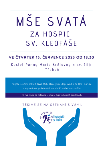 Zveme všechny na naší pravidelnou Mši svatou za Hospicovou péči sv. Kleofáše ve čtvrtek 13. července od 18.30. Přijďte vzpomenout na všechny, které jsme doprovodili v našem hospici a podpořit naši práci.