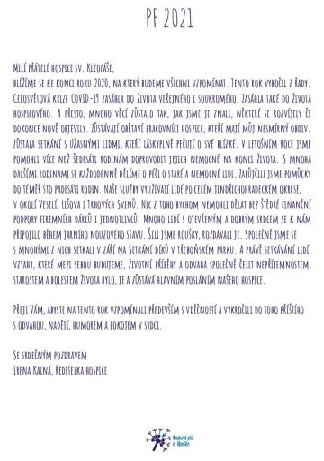 Nádherné Vánoce prožité s Vašimi nejbližšími a úspěšné vykročení do nového roku přeje celý tým Hospicové péče sv. Kleofáše! Za krásné Pfko děkujeme panu Petru Ettlerovi. Za finanční podporu tisku děkujeme Tiskárně Rain.