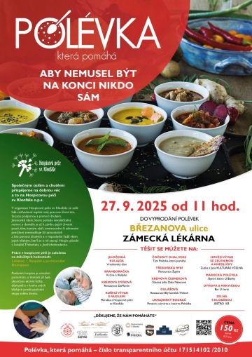 I letos si budete moci pochutnat na Polévce, která pomáhá. Zapište si do diářů sobotu 27. září od 11 hodin, kdy v horní části Masarykova náměstí v Třeboni před Zámeckou lékárnou budeme prodávat polévky, které chutnají, zahřejí a pomohou dobré věci. Těšit se můžete na rybí polévku ze Šupiny, kulajdu z Vratislavského domu, dýňovou polévku z DaMartie, zelnou s klobásou z Bistra 105, bramboračku od Kellyho a mnoho dalších...