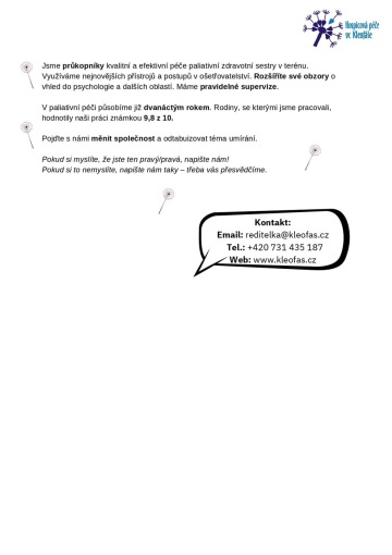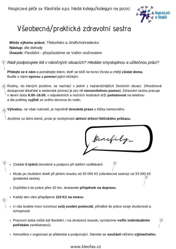 Do našeho týmu hledáme zdravotní sestru. Jste to právě vy? Rodiny, do kterých jezdíme, se nachází v jedné z nejnáročnějších životních situací. 24hodinová dostupnost lékařské a sesterské pomoci je pro ně neocenitelnou pomocí. Zdravotní sestra pracuje v denní dobu 8.00–16.00, v odpoledních a nočních hodinách drží pohotovost na telefonu a dle potřeby vyjíždí ze svého domova do rodin. Podrobnosti najdete v níže uvedeném inzerátu.
