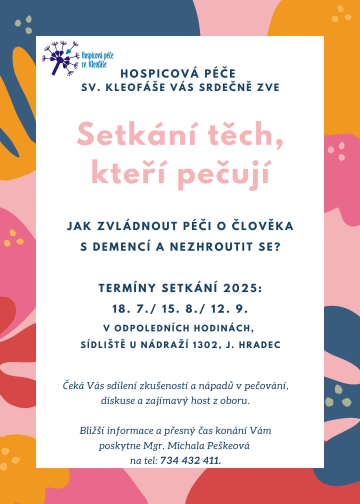 Podpořit se navzájem, sdílet zkušenosti a popovídat si s ostatními pečujícími můžete na našich setkáních, které vede odborná poradkyně Michala Peškeová. Čeká vás sdílení zkušeností a nápadů v pečování, diskuze a zajímavý host z oboru. Pro bližší informace kontaktujte Michalu Peškeovou na tel: 734 432 411.