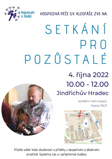 Hospicová péče sv. Kleofáše zve všechny, kterým zemřel blízký člověk, na setkání od jindřichohradecké pobočky hospice (Husova ulice 156) a to v úterý 4. října od 10 do 12 hodin. Zváni jsou všichni, kteří se vyrovnávají se ztrátou blízkého člověka a doléhá na ně samota a prázdnota, se kterou nechtějí být sami. Setkání je příležitostí pro sdílení svých pocitů i zkušeností, vzájemné obohacení a společné hledání síly a odvahy k novému vykročení. Součástí setkání může být i společné zpívání s kytarou.