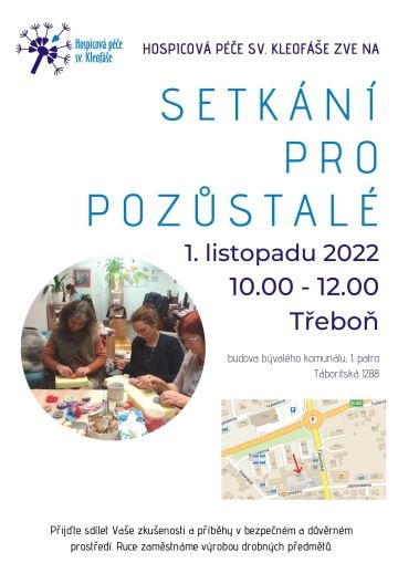 Hospicová péče sv. Kleofáše zve všechny, kterým zemřel blízký člověk, na setkání do příjemných prostor Poradny pro rodiny po ztrátě, která se nachází v budově bývalého komunálu v Třeboni (Táboritská 1288, 1. patro) a to v úterý 1. listopadu od 10 do 12 hodin. Zváni jsou všichni, kteří se vyrovnávají se ztrátou blízkého člověka a doléhá na ně samota a prázdnota, se kterou nechtějí být sami. Setkání je příležitostí pro sdílení svých pocitů i zkušeností, vzájemné obohacení a společné hledání síly a odvahy k novému vykročení. Součástí setkání může být i společná rukodělná činnost.