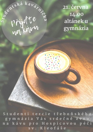 Studenti tercie třeboňského gymnázia pořádají benefiční akci pro náš hospic. Přijďte v úterý 21. června na dobrou kávu a něco sladkého na zahradu u altánku gymnázia. Společně oslavíme konec úspěšné fundraisingové kampaně Pozvěte sv. Kleofáše na kafe, kde jsme získali 71 nových dárců.
