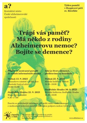Celkem čtyřmi akcemi se připojíme k celorepublikovému Týdnu paměti, který pořádá Česká alzheimerovská společnost. Zájemci v Třeboni a Jindřichově Hradci mohou získat informace o prevenci demence a jak nemoc včasně rozpoznat. Ty, kteří již vnímají potíže s pamětí a dalších rozumových schopností, můžeme následně objednat na testování paměti. Pečujícím nabídneme podporu a individuální konzultace. Všechny akce odborně vede Mgr. Michala Peškeová.