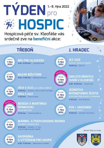 Je to již devátý podzim v pořadí, kdy se mluví o Hospicové péči sv. Kleofáše. Řeč je o tradiční akci Týden pro hospic, která je spojena s oslavami Světového dne hospicové a paliativní péče. Tento den připadá vždy na druhou říjnovou sobotu. Akce na podporu mobilní hospicové péče se konají po celém světě. Jejich společným cílem je podpořit diskuzi o tom, jak péče o lidi na sklonku života funguje a jaké jsou její možnosti. V Třeboni a v Jindřichově Hradci se v týdnu od 1. do 8. října můžeme společně setkat na celé řadě benefičních akcí. Záštitu nad celým týdnem převzal starosta města Třeboně Jan Váňa a nad akcemi v Jindřichově Hradci starosta Jan Mlčák.